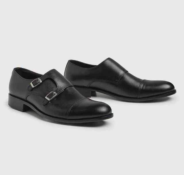 The shoes in the image are black leather double monk strap dress shoes. They have...