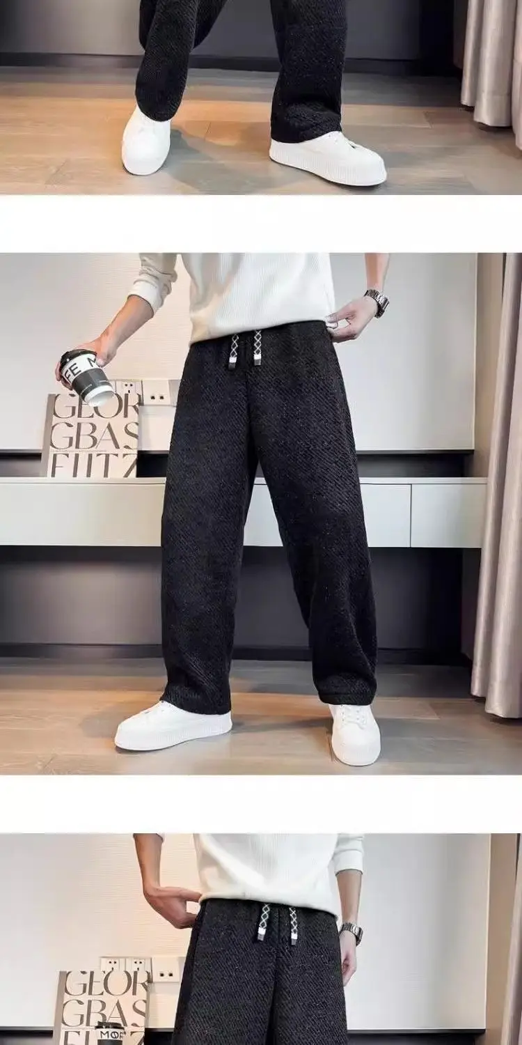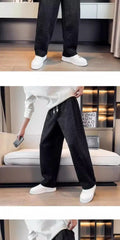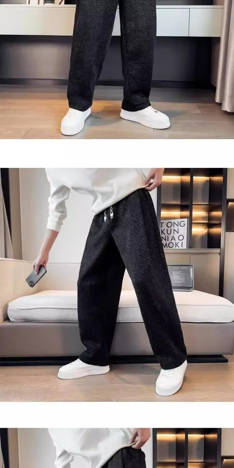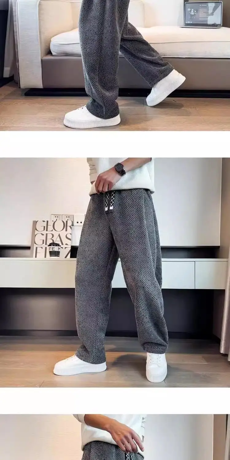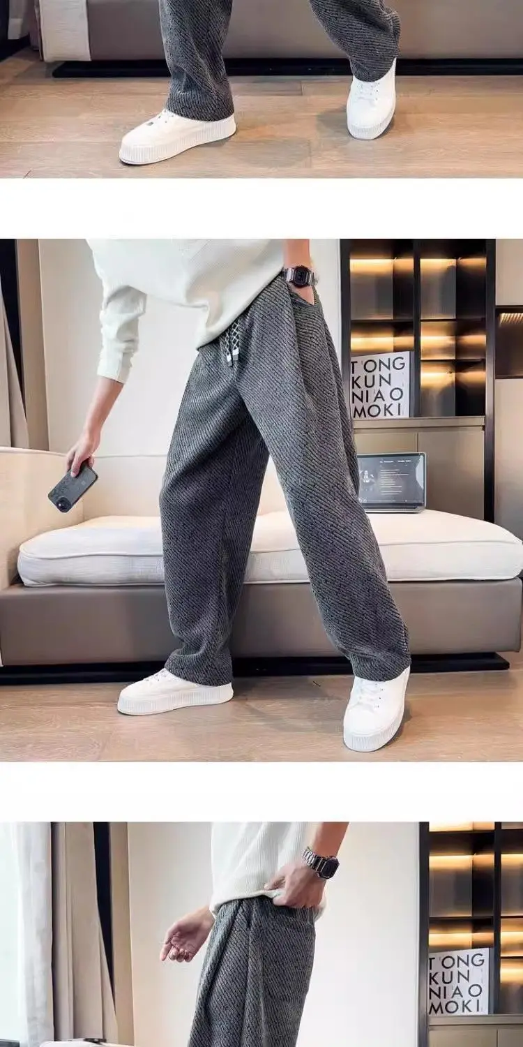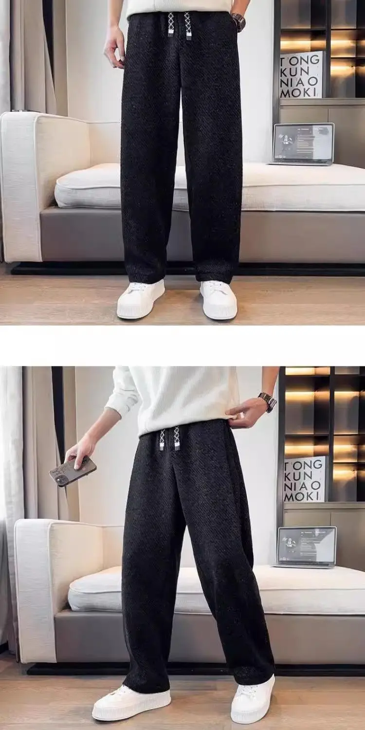 Autumn Winter Loose Men's Sherpa Fabric Straight Pants Man Fashion Thick Pockets Trousers Solid Color Male Clothes